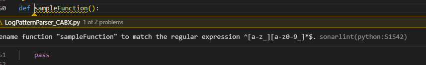 As you write code, SonarLint will display warnings and errors in the margin of your code, indicating any issues it finds. You can hover over the message to see more detailed information about the issue, and you can click on it to go to the relevant line of code. One such example is shown in the picture below where SonarLint is raising issue related to the naming convention of the function.